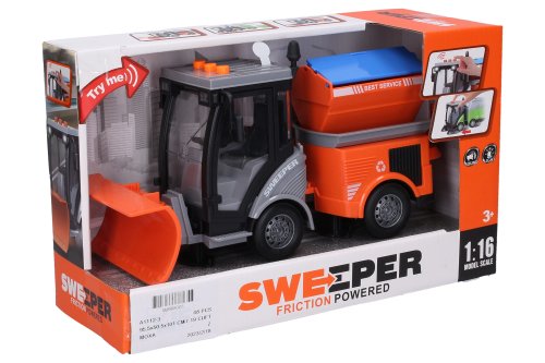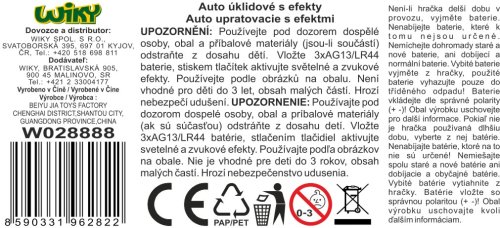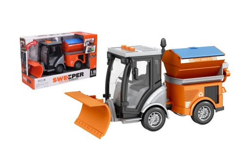 Auto úklidové s efekty. Velikost 28 cm. Na setrvačník. Světelné a zvukové efekty tlačítky na kabině auta (startování, troubení, couvání). 3xAG13 baterie součástí.