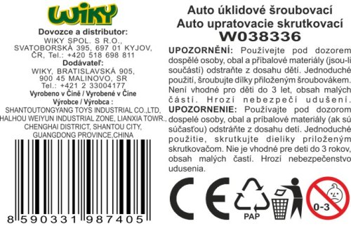 Auto úklidové šroubovací. Rozměry 16x11x12 cm. Volná kola. Obsahuje auto, šroubovák. 2 varianty - sklápěč, popelářské.