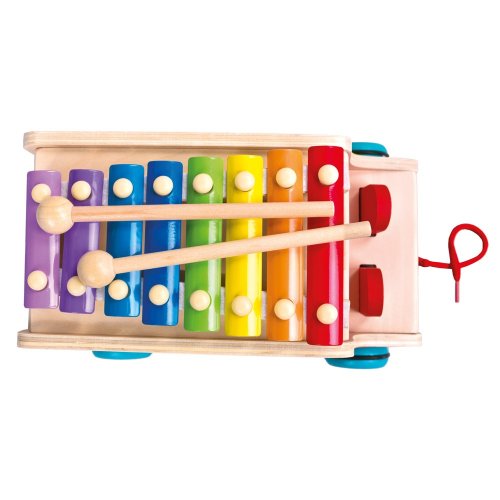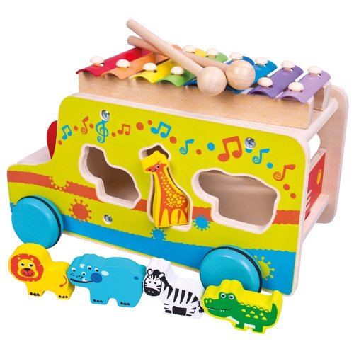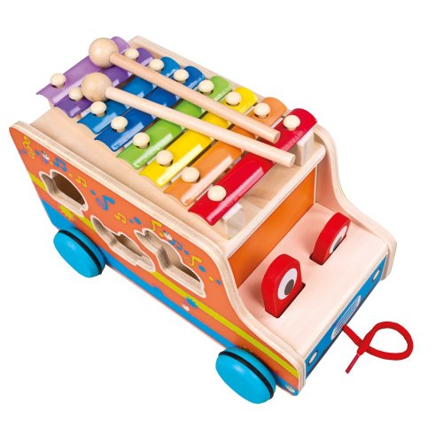 Pestrobarevný náklaďák poulící očima, vezoucí figurky exotických zvířátek může dítě doprovázet na jeho cestách, díky praktické šňůře slouží také jako tahací hračka. Nejen to, na střeše je vybaven xylofonem s dvojící paliček, se kterým může dítě objevovat své nadání. Rozvíjejte jemnou motoriku, vkládejte a rozpoznávejte tvary, barvy a druhy zvířat. Učte dítě opatrně chodit, aby zvířátka nevysypalo. A představte mu melodie prvních říkanek. Hračka je robustní, vyrobena z masivního dřeva. Kolečka jsou opatřena gumovými kroužky zaručujícími tichý chod a šetřícími podlahu. Hlavní vlastnosti:náklaďák s 2 paličkami a 6 dílů ke vkládánímultifunkční – vkládací, tahací i hudební hračkarozvíjí sluch, motoriku, rozpoznávání barev a tvarůrobustní dřevěné provedenítichá a šetrná kolečka
