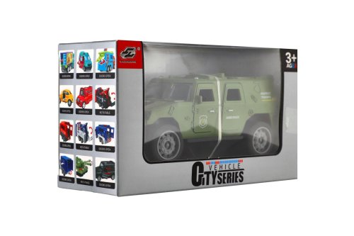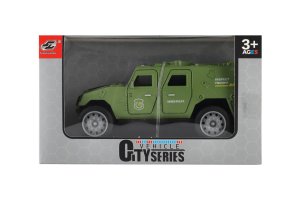 Vojenské auto o délce 13 cm je vyrobeno z odolného plastu a vybaveno mechanickým pohonem na setrvačník, který zajišťuje plynulý pohyb vpřed po natažení. Model v realistickém designu potěší všechny malé milovníky armádních vozidel a akčních scén. Balení obsahuje jedno auto v barevné dárkové krabičce, ideální také jako dárek.