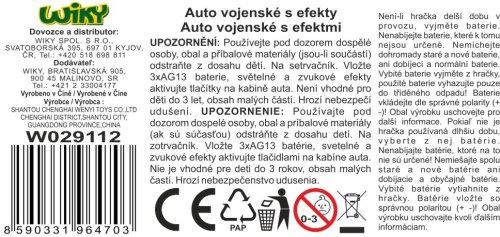 Auto vojenské s raketou. Velikost 19 cm. Na setrvačník. Světelné a zvukové efekty tlačítky na kabině auta. Pohyblivé odpalovací zařícení. 3xAG13 baterie součástí.