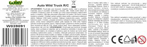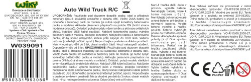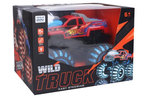 Auto Wild Truck se svítícími koly RC na dálkové ovládání. Rozměry 26,5x22x21 cm. Frekvence 2.4GHz. Svítící kola a motor - levým a pravým předním tlačítkem na ovladači. 7.4V 500mAh bateriový pack do auta součástí, 2xAA do ovladače nejsou součástí. USB kabel součástí. Přepínač ON/OFF na boční straně auta, tlačítko ON/OFF na ovladači.