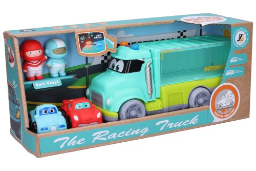 Auto závodní s efekty set 4ks. velikost auta 26cm. Obsahuje velké auto, 2malé auta 7cm, 2 panáčky. Světelné a zvukové efekty. Setrvačník. Baterie 3xAG13 součástí.