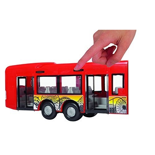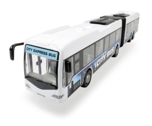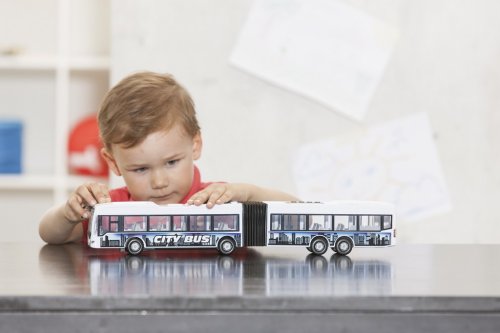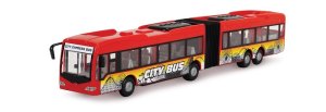 Kloubový autobus na setrvačník, otevírací dveře. Délka 46 cm. 2 barevná provedení.