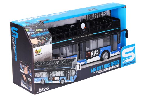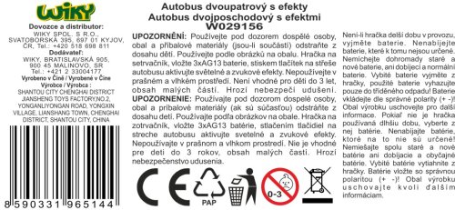 Autobus dvoupatrový vyhlídkový s efekty. Rozměry 28,5x6,5x12 cm. Na setrvačník. Světelné a zvukové efekty tlačítky na střeše. 3xAG13 baterie součástí. Otevírací dveře kolečky nad okny.