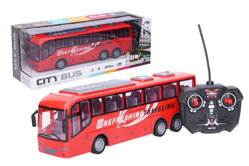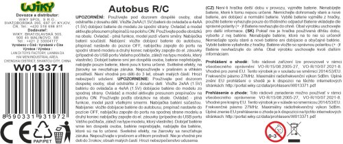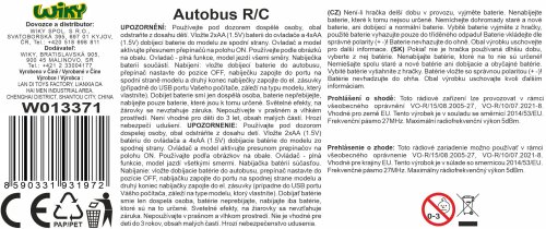 Autobus RC na dálkové ovládání. Velikost 32 cm. Frekvence 27MHz. Světelné efekty. Nabíjecí 4xAA baterie do autobusu a nabíjecí adaptér součástí, 2xAA do ovladače nejsou součástí.