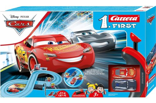 Autodráha Carrera FIRST dlouhá 2,4m s auty Blesk McQueen a Jackson Storm z filmu CARS, pro děti od 3 let, na baterie, obsahuje rovinky, zatáčky, točíčí bránu, ovladače a dekorace s tématikou CARS. Délka trati: 2,4m Rozměry po sestavení: 93 x 45 cm Rozměry balení 50 x 30 x 7 cm.