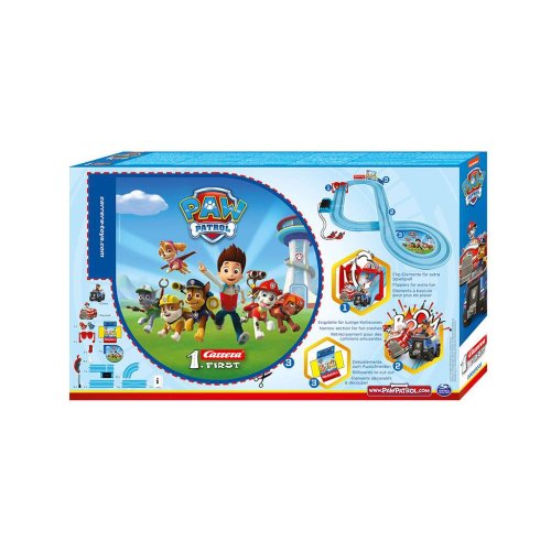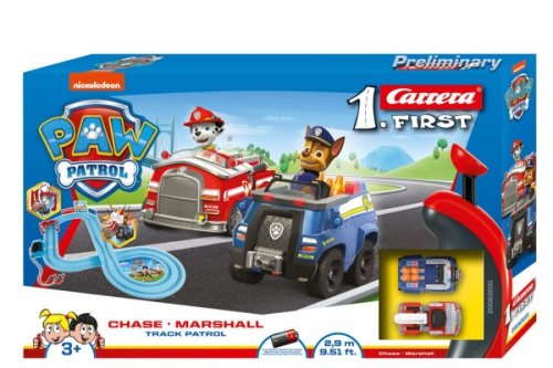 Autodráha Carrera FIRST dlouhá 2,9 m s auty ze seriálu Paw Patrol, obsahuje rovinky, zúžení dráhy pro možné srážky, zatáčky, točící bránu, ovladače a dekorace s tématikou Paw Patrol, na baterie. Rozměr krabice: 114 x 88 cm Vhodné od 4 let