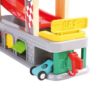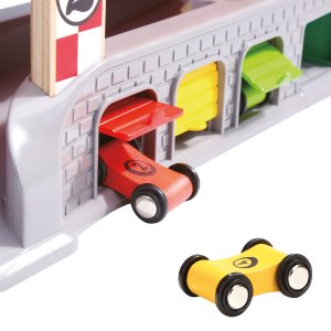Autodráha s garážemi obsahuje čtyři barevná dřevěná autíčka, která se mohou přetáčet a tak snadno zdolávají kaskádu barevných silniček. Postavte autíčko na nejvyšší část autodráhy a sledujte, co udělá! Zábavná hračka, kterou si zamilují nejen kluci. Rozměr 9x33x34 cm.