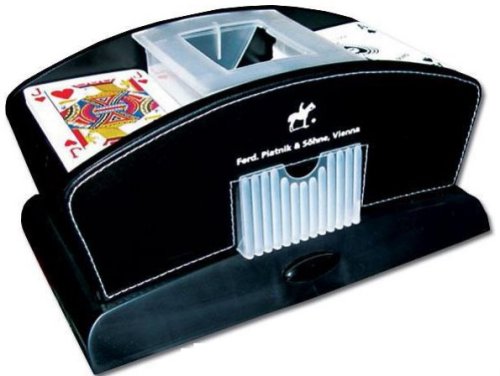 Automatická míchačka karet udělá vše za Vás. Míchačka je elektrická a během chvilky dokáže dokonale zamíchat karty. Pojme až dva balíčky karet. Karty nejsou míchány pravidelně ale náhodně.
