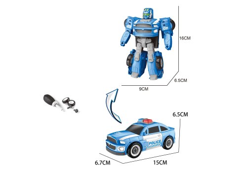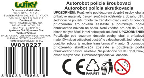 Autorobot policejní šroubovací. Rozměry 15x6,7x6,5 cm. Volná kola. Obrázkový návod na sestavení na spodní straně obalu. Obsahuje - auto, šroubovák.