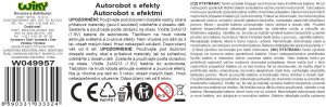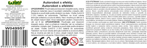 Autorobot s efekty. Vydává světelné a zvukové efekty. Rozměry robota 38x30x13 cm. Tlačítko na hrudní části robota. Baterie 2xAG13 nejsou součástí.