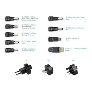 Výstupní napětí 18,5 - 20V, výkon 45W, 9x konektor, napájecí kabel, EU, US a UK zástrčky.