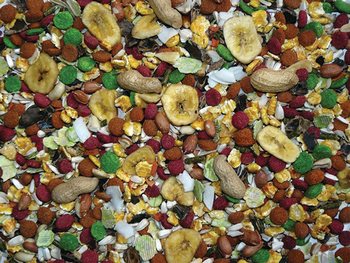 složení: ovoce, (banány, jablka, rozinky, aronie), pšenice, kukuřice, pšeničné vločky, svatojánský chléb, burské ořechy, hrachové vločky, safrol, slunečnice, kukuřičné vločky, čirok, ječmen, vojtěška, oves, mrkev, pohanka.