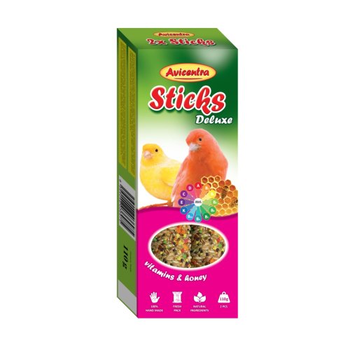 Avicentra Deluxe tyčinky s vitamíny a medem pro kanáry jsou lahodnou a výživnou pochoutkou, která doplňuje každodenní jídelníček a dodává ptáčkům důležité vitamíny a minerály. Jemná kombinace semínek, obilovin a medu vytváří přirozeně atraktivní odměnu, kterou si kanáři rychle oblíbí. Tyčinky zároveň podporují přirozené ozobávání a poskytují zábavu a aktivitu v kleci.