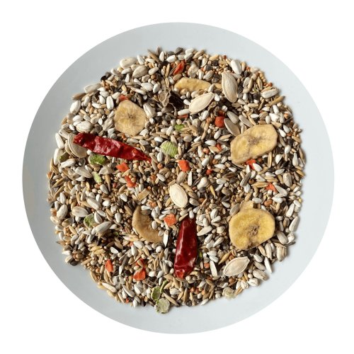 Složení: Světlice barvířská, oves nahý, pohanka, slunečnice bílá, čirok bílý, lesknice, paddy rýže, čirok červený, proso žluté, proso bílé, oves celý, proso červené, hrachové vločky, sušené banány, pšenice, konopné semeno, ostropestřec mariánský, svatojánský chléb, dýně, sušená mrkev, ječmen, chilli papričky.