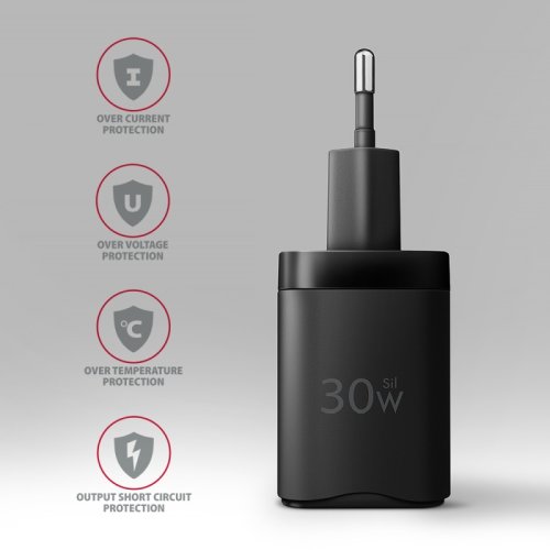 Kompaktní USB nabíječka do sítě AXAGON ACU-PD30 Sil pro rychlé nabíjení mobilních zařízení. Díky maximálnímu výkonu 30W nabíječka dobíjí telefony, tablety a další mobilní zařízení nejvyšší možnou rychlostí. Adaptér nabízí oboustranný USB-C konektor. Kompaktní velikost a vysoký výkon je daný použitou novou Sil technologií. Super silicon využívá vyspělé materiály na bázi křemíku. Nabíječka tak může dosáhnout menších rozměrů a současně bezpečného, stabilního a rychlého nabíjení. Účinnost je tak shodná s GaN technologií při zachování příznivé ceny. Nabíječka je vybavena výstupem Power Delivery 3.0 / Quick Charge 4+ USB typu C, což umožňuje rychlé nabíjení smartphonů a tabletů výkonem až 30W. Nabíječka podporuje 20W PD nabíjení pro iPhone 12, 13, 14 a 15 a nabízí také 27W PD nabíjení pro iPhone 13 Pro, 14 Pro, 15 Pro a jejich modely Pro Max. Kromě toho podporuje 25W SFC nabíjení pro Samsung Galaxy S20 - S24, Note a Z Fold series a také nabízí 30W SFC nabíjení pro Samsung Galaxy S20 - S24 Ultra, Tab S7+ - S9+, Tab S8 - S9 Ultra. Adaptér je dále kompatibilní s dalšími standardy rychlého nabíjení telefonů, jako jsou Apple iPhone, iPad, Samsung, Huawei, Honor, Xiaomi. Pokročilý systém ochran na výstupu nabíjecího adaptéru chrání nabíjené zařízení před poškozením. Funkce nabíječky také zajistí rozpoznání nabíjeného zařízení a zvolení optimální rychlosti a průběhu nabíjení. Tělo napájecího adaptéru má příjemný tvar a kompaktní velikost. Proti klasickým nabíjecím adaptérům stejných parametrů je velikost nabíječky až o třetinu menší. Kombinace malých rozměrů, dosažených pomocí Sil technologie, širokému rozsahu vstupního napětí a univerzálním možnostem výstupu, dělá z nabíječky ideálního pomocníka na cesty.