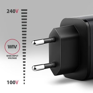 Cestovní nabíječka do sítě AXAGON ACU-PQ67 GaN umožňuje rychlé nabíjení až dvou mobilních zařízení současně. Díky celkovému výkonu 67W dokáže nabíječka dobíjet notebooky, tablety, telefony a další mobilní zařízení nejvyšší možnou rychlostí. Adaptér nabízí nejen standardní USB-A konektor, ale také oboustranný USB-C konektor. Kompaktní velikost a vysoký výkon je daný využitím nové GaN technologie. Použité součástky s Nitridem Galia pracují s vysokou účinností, což umožňuje dosahovat vysokých výkonů při malé velikosti. Nabíječka je vybavena výstupem Power Delivery 3.0 / Quick Charge 4+ USB typu C a Quick Charge 3.0 USB typu A, díky čemuž umožňuje rychlé nabíjení nejen smartphonů a tabletů, ale i notebooků. Technologie Quick Charge 4+ umožňuje až 4x rychlejší nabíjení telefonů než běžná USB nabíječka. Technologie Power Delivery 3.0 nejenže podporuje nabíjení moderních telefonů, ale také umožňuje 67W nabíjení moderních notebooků. Apple zařízení podporují rychlé nabíjení, jehož maximální výkon se liší podle konkrétního modelu: iPhone 12-15 podporují nabíjení až 20W, iPhone 16 a 16 Pro až 24W, modely iPhone 13 Pro až 15 Pro a iPhone 17 až 27W. Vyšší výkon nabízí iPhone 16 Pro Max až 30W a iPhone 17 Pro a Pro Max až 40W. Nabíječka je kompatibilní také s iPady a notebooky Apple MacBook Air a Pro. Samsung telefony Galaxy podporují rychlé nabíjení Super Fast Charging až 25W SFC pro řady Galaxy S20-S25 a skládací modely Z Fold a Z Flip. Vybrané modely Galaxy Ultra a tablety Galaxy Tab umožňují ještě rychlejší nabíjení až 45W SFC 2.0. Podporovány jsou také ostatní značky, jako jsou Motorola, Google Pixel, Xiaomi, Honor, Oppo, OnePlus, Realme a další běžné telefony a tablety. Nabíječka je vhodná i pro nabíjení notebooků s technologií PD 3.0 až do 67W, včetně značek Lenovo, HP, Dell, Acer, Asus a dalších. Pokročilý systém ochran na výstupu nabíjecího adaptéru chrání nabíjené zařízení před poškozením. Funkce nabíječky také zajistí rozpoznání nabíjeného zařízení a zvolení optimální rychlosti a průběhu nabíjení. Tělo napájecího adaptéru má příjemný tvar a kompaktní velikost. Ve srovnání s klasickými nabíjecími adaptéry se stejnými parametry je velikost této nabíječky až o polovinu menší. Kombinace malých rozměrů, dosažených pomocí GaN technologie, a širokého rozsahu vstupního napětí, dělá z této nabíječky ideálního pomocníka na cesty.