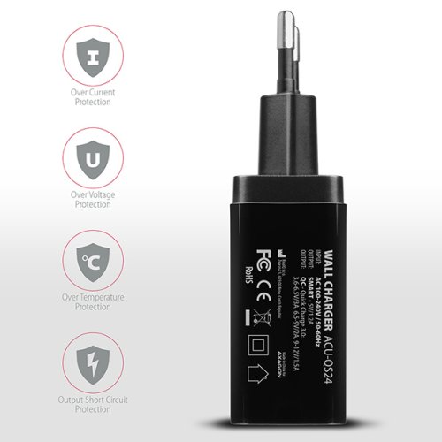 Univerzální USB nabíječka do sítě pro rychlé nabíjení až dvou zařízení současně. Díky celkovému výkonu 24 W nabíječka dobíjí telefony, tablety a další zařízení nejvyšší možnou rychlostí. K dispozici jsou dva USB výstupy s podporou standardního nabíjení 5 V / 1,2 A a rychlého nabíjení až 12 V / 1,5 A. Funkce AIC rozpozná připojené zařízení a automaticky zvolí optimální rychlost nabíjení. Nabíječka podporuje protokoly USB Battery Charging 1.2, Apple Fast Charge, Huawei FCP, Quick Charge 1.0/2.0/3.0 a Samsung AFC. Samozřejmostí je pak ochrana proti přetížení, přepětí, přehřátí a zkratu na výstupu.