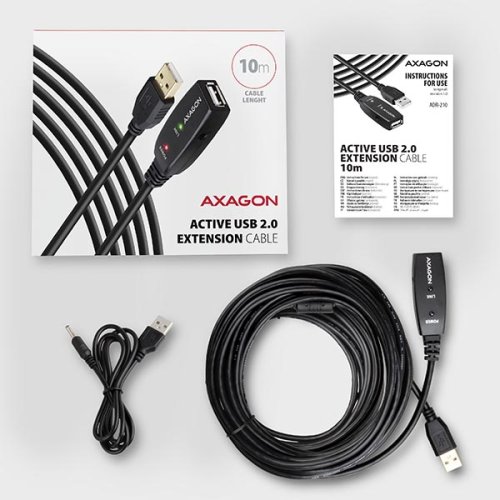 Aktivní prodlužovací USB 2.0 kabel AXAGON ADR-210 délky 10 metrů je ideální k propojení Vašeho počítače s USB zařízením jako je myš, klávesnice, webkamera, tiskárna, skener, plotr a dalšími. Aktivní USB repeater kabel zesiluje průchozí signál a umožnuje připojit USB zařízení na výrazně větší vzdálenost, než Vám umožní pasivní kabel. Dosah kabelu je možné dále prodloužit použitím několika kabelů za sebou. Velkou výhodou kabelu ADR-210 je integrovaný konektor přídavného napájení. Ve většině případů postačí napájení po USB sběrnici, avšak u zařízení s větším odběrem může být při větších vzdálenostech USB napájení nedostatečné a přídavné napájení ze sítě může v těchto případech problém vyřešit. Výjimečně kompaktní tělo repeater kabelu dovoluje bezproblémové použití v elektromontážních lištách nebo kabelových systémech. Použití kvalitního stíněného kabelu zaručuje vysokou rychlost komunikace a minimální nežádoucí interference.