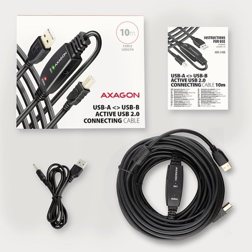 Balení v kartonové krabičce obsahuje: • USB 2.0 A-M > B-M aktivní kabel délky 10 m, • USB-A / 3.5 mm napájecí kabel, • vícejazyčný návod CZ/DE/DK/ENG/ESP/FIN/FR/GR/HR/HU/IT/NL/PL/PT/RO/RU/SK/SWE/BG/CN/TR/ARA.