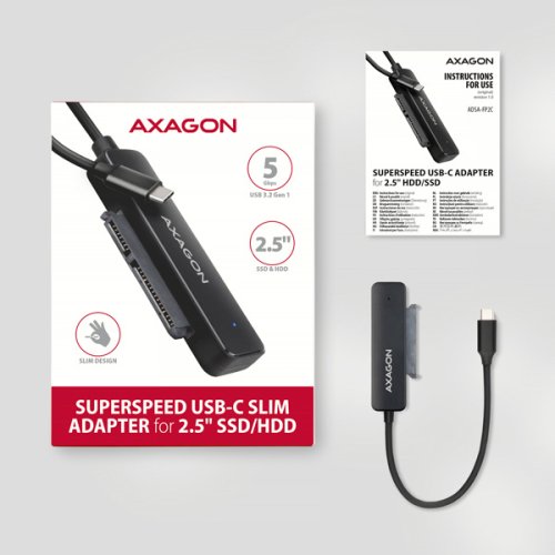 Kompaktní AXAGON ADSA-FP2C SLIM adaptér s USB-C 5Gbps a SATA 6G rozhraním určený pro 2.5" SATA pevné disky nebo SSD. Připojení k počítači umožňuje napevno uchycený USB-C kabel délky 20 cm. Díky rozhraní USB 3.2 Gen 1 je přenosová rychlost až 5 Gb/s, funkce Plug & Play zajistí automatické připojení k počítači. Adaptér také podporuje všechny důležité funkce pro bezproblémovou práci s různými typy disků. Jsou to UASP pro rychlejší přenos dat, TRIM pro omezení pozvolné degradace výkonu SSD v čase, S.M.A.R.T. pro monitoring stavu disků, BOOT pro možnost bootování z disků připojených k adaptéru, Auto Spindown pro automatické uspání disků při delší nečinnosti, Turn Off pro vypnutí disků po odebrání zařízení nebo uspání PC a USB Bus Power pro napájení adaptéru včetně připojeného disku jen z USB sběrnice. Štíhlý a kompaktní adaptér umožňuje snadnou a rychlou výměnu disku bez potřeby montáže, současně díky svým minimálním rozměrům může být kdykoli pohotově po ruce. Matné provedení krytu brání nežádoucím otiskům prstů. Uvedené vlastnosti dělají z adaptéru šikovný a užitečný nástroj pro častou práci s různými druhy disků. Jedná se tak o ideálního pomocníka pro zálohování, migraci, přenos, ukládání a obnovu dat, testování disků apod.