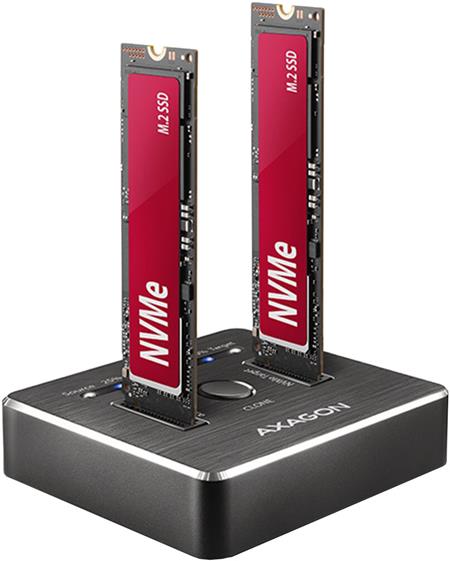 Dokovací stanici také využijete pro snadné klonování obsahu připojených NVMe disků bez potřeby připojení k PC. Do prvního slotu stanice (source) zasunete zdrojový M.2 disk a do druhého slotu (target) zasunete cílový M.2 disk. Pak jen zmáčknete klonovací tlačítko a sledujete průběh klonování na stupnici ze čtyř LED diod. Po zkopírování všech dat je na cílovém disku přesná kopie původního M.2 disku. Dock tak lze využít jako autonomní zařízení pro pohodlné duplikování a vytváření obrazů disků. Jedná se o nejjednodušší způsob, jak přenést obsah jednoho SSD disku na další SSD disk, a to včetně funkčního operačního systému (Windows, macOS, Linux …).
