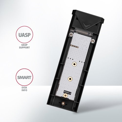 Mezi další přednosti patří možnost uchycení SSD hned ve třech různých délkách – 42, 60 a 80 mm. Konstrukce umožňuje montáž i demontáž M.2 SSD pomocí jediného šroubku, takže celý proces je rychlý a jednoduchý. Vnější kovový plášť je nejenom elegantní na pohled, ale také zvyšuje celkovou odolnost a zabraňuje ulpívání otisků prstů. Hliníkové tělo boxu AXAGON EEM2-UB2 také zefektivňuje chlazení a podporuje dlouhou životnost.