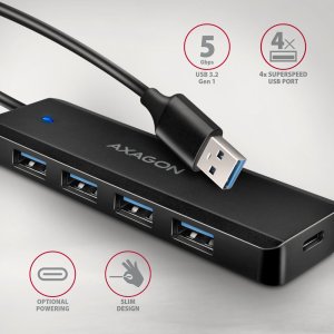 Kompaktní a lehký rozbočovač AXAGON HUE-C1A vám zprostředkuje rozmanité možnosti připojení na cestách. Během okamžiku máte k dispozici 4 porty USB pro připojení kompatibilních zařízení. Možnost externího napájení Hubu z nabíječky s konektorem USB-C ocení všichni moderní uživatelé. Díky tomuto externímu nabíjení snadno připojíte další externí disky k PC nebo můžete současně nabíjet více mobilních telefonů apod.