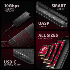 Unikátní vlastností, díky použitému čipsetu, je možnost použití jak M.2 NVMe tak i SATA disků. Nemusíte tak přemýšlet jaký typ M.2 disku do boxu vložíte. Výhodou je uchycení rovnou pro čtyři různé délky SSD karet – 30, 42, 60 a 80 mm. M.2 karty mohou být jednostranné nebo oboustranné. Box nemá omezení kapacity vloženého SSD disku.