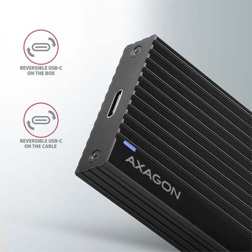 Super rychlý externí AXAGON EEM2-GTR THIN RIB box s USB 3.2 Gen 2 rozhraním je určen pro NVMe (PCI-Express) M.2 SSD disky. Spolehlivé připojení k počítači umožňuje oboustranný USB-C konektor na boxu spolu s dodávaným kabelem USB-C -- USB-C.
