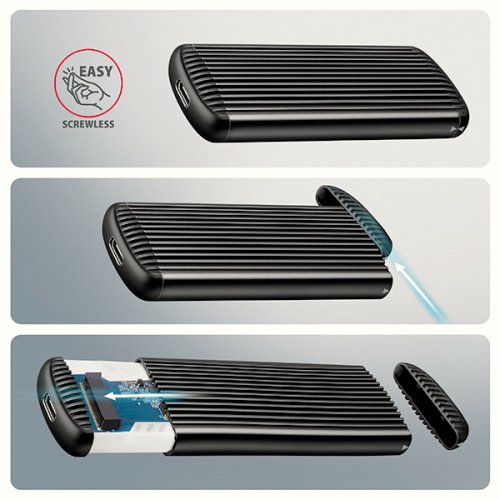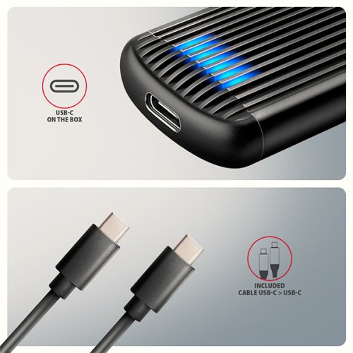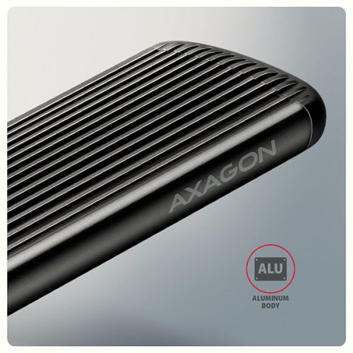 Hliníkový externí AXAGON EEM2-SC RIBBED box s USB 10Gbps rozhraním určený pro M.2 NVMe SSD disky. Stabilní a rychlé připojení zajišťuje oboustranný USB-C konektor. V balení naleznete kabel USB-C -> USB-C pro připojení boxu k počítači. Díky USB 10Gbps rozhraní je přenosová rychlost až 10 Gb/s. Externí M.2 box podporuje moderní funkce např. UASP, TRIM a umožňuje čtení S.M.A.R.T. informací monitorujících stav disku. Výhodou boxu je uchycení rovnou pro čtyři různé délky SSD disku - 30, 42, 60 a 80 mm. M.2 disky mohou být jednostranné nebo oboustranné. Box nemá omezení kapacity vloženého SSD disku. Bezšroubové otevírání usnadňuje montáž i demontáž M.2 SSD disku. Díky tomu je výměna disků rychlá a snadná a výrazně urychluje práci při migraci dat, testování, klonování či rozšiřování úložiště. Žebrovaný design a hliníkový plášť boxu zajistí velmi dobré chlazení vloženého M.2 SSD disku. Prodlužuje se tak jeho životnost a také je zamezeno zpomalování rychlosti disku tzv. „Thermal Throttling“. Vnější kovový plášť je proveden v černé barvě a brání nežádoucím otiskům prstů. Vložením M.2 SSD disku do tohoto boxu snadno vytvoříte rychlý a univerzální externí disk. Box je možné použít jak s počítači a notebooky, tak s mobilními telefony a tablety.