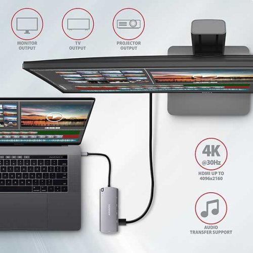 Výstup HDMI: • HDMI. • Konektor HDMI A (F) female. • Maximální podporované rozlišení 4K / 4096 x 2160 při 30 Hz. • Pro funkci video výstupu je nutné hub zapojit do USB-C portu s podporou DisplayPort Alternate Mode (DP Alt Mode) nebo do USB-C portu s podporou Thunderbolt 3. Dále je nutný vhodný OS. Bez této podpory nebude funkce video výstupu dostupná. • Podpora HPD (Hot-Plug-Detect). • Podpora TMDS (Transition Minimized Differential Signaling). • Plná podpora HDCP 1.4 a 2.3 (High-bandwidth Digital Content Protection). • Podpora až 8kanálového LPCM zvuku, komprimovaného audia (AC-3, DTS) a HBR audio formátů. • Podpora vzorkovací frekvence až 192 kHz a až 24bitového zvuku – závisí na zdrojovém a koncovém zařízení, tj. notebooku/telefonu a TV/monitoru/AV receiveru.