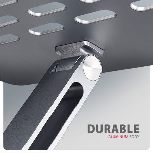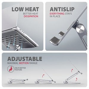 Vlastnosti stojanu: • Lehká a pevná kovová konstrukce. • Protiskluzová úprava, která zároveň chrání zařízení od poškrábání. • Vhodný pro 10" - 16" notebooky, nebo jiná zařízení. • Nastavitelná výška až 205 mm. • Mnoho nastavitelných poloh • Nastavení sklonu podstavce (180° - 90°) • Nastavení sklonu ramene (180° - 90°) • Skladný a lehce složitelný. • Lepší odvod tepla z notebooku.
