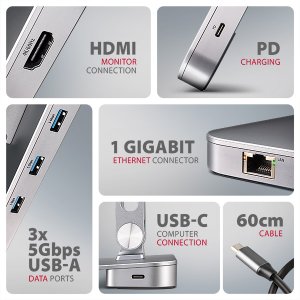 AXAGON HMC-STND 7in1 Hub & Stand je jedinečný multifunkční hub integrovaný do stojanu pro notebook nebo tablet. Tento hub rozšíří Váš notebook nebo tablet o dalších šest portů. Váš notebook připojíte k hubu přes USB-C <-> USB-C kabel dlouhý 60 cm. Okamžitě tak máte k dispozici připojení pro monitor, tři USB zařízení, konektor RJ-45 pro Gigabitovou ethernet síť a napájení notebooku pomocí technologie Power Delivery. Stojan s dvěma klouby zlepšuje ergonomii a pohodlí při práci a je vhodný pro zařízení od 10" do 16". Je ideální jako dokovací stanice 7v1 pro Windows notebooky i Apple MacBook Air nebo MacBook Pro. Tři USB-A 5Gbps výstupy umožňují připojení externích disků (až 2 současně), flash disku, myši, tiskárny a dalšího USB příslušenství. USB porty také nabíjí mobilní telefony a tablety výkonem až 7.5W. Gigabitová síťová karta rozšíří počítač o rychlé a stabilní síťové připojení, doplní chybějící síťový RJ-45 Ethernet konektor, nebo přidá další síťovou kartu. HDMI výstup umožňuje připojení externího monitoru, TV nebo projektoru s rozlišením až 4K/60Hz Ultra HD, 2K/120Hz Quad HD nebo 1080p/200Hz Full HD a přenos vícekanálového zvuku. Díky podpoře HDR si můžete vychutnat výrazně rozšířený rozsah barev a kontrastů bez omezení. PD USB-C vstup je určen pro vhodnou Power Delivery nabíječku. Díky tomu je vaše mobilní zařízení i hub napájen přímo z PD nabíječky s využitím technologie Power Delivery 3.0 s výkonem až do 100W. Druhý USB-C konektor slouží k propojení s notebookem pomocí přiloženého 60 cm dlouhého kabelu s oboustranným USB-C konektorem na obou koncích. Díky funkcím Plug and Play a Hot Plug je samotné zapojení hubu velmi jednoduché bez složité instalace, a také lze jednoduše připojovat a odpojovat periferie za běhu počítače. Velkou výhodou stojanu je chytré řešení s dvojitým kloubem, které umožňuje nastavit úhel náklonu i výšku obrazovky notebooku tak, aby byla v jedné rovině s externím monitorem. Tím získáte další pracovní plochu ve správné úrovni očí, což výrazně zlepšuje ergonomii, zvyšuje pohodlí při práci a podporuje vaši produktivitu. Elegantní design tohoto stojanu nejen stylově doplní váš pracovní stůl, ale zároveň nabízí praktické funkce. Podstavec i kryt hubu jsou vyrobeny z robustních hliníkových odlitků, které zajišťují pasivní chlazení a garantují dlouhou životnost a spolehlivost stojanu i hubu. Výřezy v podstavci navíc optimalizují odvod tepla z notebooku, což přispívá k vyššímu výkonu a delší životnosti vašeho zařízení. Díky protiskluzové úpravě zůstane vaše zařízení bezpečně na svém místě bez rizika nechtěných pohybů, a to bez jakéhokoliv poškození povrchu notebooku nebo podložky.