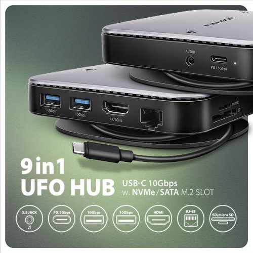 AXAGON HMC-UFO USB-C 10Gbps UFO hub rozšíří Váš notebook, počítač nebo tablet o osm portů a externí box pro M.2 disk. Váš notebook připojíte k dokovací stanici 9in1 přes USB-C 65 cm dlouhý kabel. V okamžiku tak máte k dispozici integrovaný slot pro NVMe nebo SATA M.2 disk, čtečku SD i microSD karet a konektory pro připojení monitoru, USB zařízení, sluchátek, síťového kabelu a Power Delivery napájení. Kompatibilita s Thunderbolt 3/4 vám také poskytne jednoduchou a skladnou dokovací stanici k notebooku jako je například Apple MacBook Air nebo Pro. Pro správnou funkci hubu je nutné, aby USB-C port vašeho notebooku podporoval video výstup (DisplayPort Alternate Mode nebo Thunderbolt 3 a vyšší) a Power Delivery napájení. NVME nebo SATA M.2 SSD disk připojíte díky vestavěnému slotu na vrchní straně hubu. Multiport hub se tímto stává i externím diskem. Karty M.2 mohou být jednostranné nebo oboustranné o rozměrech 22x42, 22x60 a 22x80 mm. Externí M.2 úložiště nemá omezení kapacity SSD disků, podporuje funkce TRIM a UASP a umožňuje čtení S.M.A.R.T. informací monitorujících stav disku. Horní kryt M.2 slotu je vyroben z hliníku, který zajišťuje optimální ochranu a odvod tepla. Díky bezšroubkové montáži je výměna disků snadná a rychlá. V balení naleznete pasivní chladič, jenž účinně napomáhá snížení teploty M.2 disků. Díky průduchům kolem krytu je zajištěna dostatečná cirkulace vzduchu, čímž se také podporuje efektivní odvod tepla. HDMI výstup umožňuje připojení externího monitoru, TV nebo projektoru s rozlišením až 4K/60Hz Ultra HD, 2K/144Hz Quad HD nebo 1080p/240Hz Full HD a přenos vícekanálového zvuku. Díky podpoře HDR si můžete vychutnat výrazně rozšířený rozsah barev a kontrastů. Dva USB-A 10Gbps výstupy umožňují připojení externích disků, flash disku, myši, tiskárny a dalšího USB příslušenství. USB porty také nabíjí mobilní telefony a tablety výkonem až 7.5W. Hub je také vybaven kombinovaným USB-C portem, který může být použit pro přenos dat (USB 5Gbps), nebo pro nabíjení notebooku pomocí Power Delivery nabíječky. S využitím vhodné PD nabíječky tak napájíte nejen notebook, ale i samotný hub, s výkonem až 100W díky technologii Power Delivery 3.0. Čtečka paměťových karet podporuje čtení a zápis všech verzí SD a microSD karet s kapacitou až 2TB. Card reader umožňuje současnou práci s kartami v obou slotech a přímé kopírování mezi nimi. K připojení stereo sluchátek, headsetu nebo aktivních reproduktorů můžete použít zvukový výstup 3.5 mm. Ten je vybaven vysoce kvalitním DAC převodníkem, který podporuje vzorkování až 384 kHz při 24 bitech. Užijete si tak špičkovou kvalitu zvuku, která je ideální pro bezztrátové formáty jako FLAC, WMA, WAV, APE, AAC či ALAC. Gigabitová síťová karta rozšíří počítač o rychlé a stabilní síťové připojení, doplní chybějící síťový RJ-45 Ethernet konektor, nebo přidá další síťovou kartu. Díky promyšlenému designu se čtyřmi gumovými podložkami na podstavci zůstane stanice pevně na svém místě. Jednou z nejpraktičtějších funkcí je uchycení USB-C kabelu, který je elegantně omotaný kolem podstavce. Díky tomuto řešení si můžete snadno odvinout přesně takovou délku kabelu, jakou aktuálně potřebujete, což zamezuje tomu, aby vám přebytečný kabel zbytečně zabíral místo na stole. Díky funkcím Plug and Play a Hot Plug je samotné zapojení hubu velmi jednoduché bez složité instalace, a také lze jednoduše připojovat a odpojovat periferie za běhu počítače. Rozbočovač se nezalekne ani připojení k telefonům s USB-C konektorem. K telefonu tak připojíte například flash disk, klávesnici, myš, monitor, TV nebo projektor.