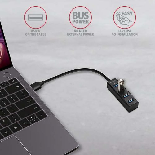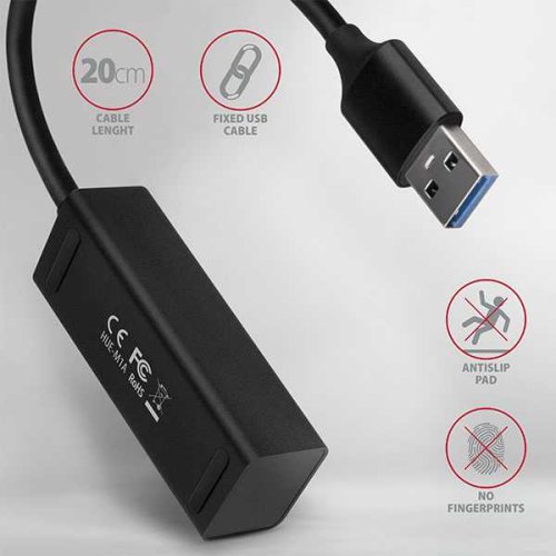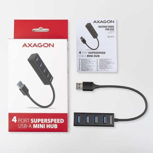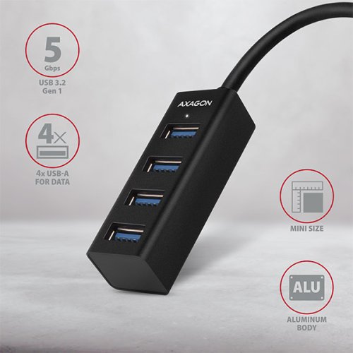 Miniaturní kovový USB 3.2 Gen 1 (USB 3.0) hub AXAGON HUE-M1A snadno a rychle připojí k notebooku nebo počítači až čtyři USB zařízení současně. Kovové tělo hubu je vyrobeno z hliníku a zajišťuje tak dokonalou mechanickou ochranu pro časté přenášení. Elegantní, jemně strukturovaný povrch brání nežádoucím otiskům. Gumové nožky zabraňují klouzání hubu po stole. Napevno uchycený USB kabel délky 20 cm je ideální pro uživatele mobilních zařízení.