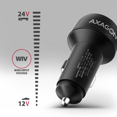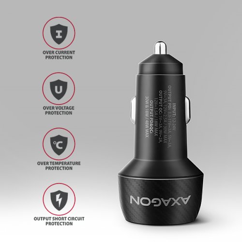 Univerzální nabíječka do auta AXAGON PWC-PQ48 umožňuje rychlé nabíjení až dvou mobilních zařízení současně pohodlně na cestách. Díky celkovému výkonu 48W dokáže nabíječka dobíjet telefon a tablety nejvyšší možnou rychlostí. Adaptér nabízí nejen standardní USB-A konektor, ale také oboustranný USB-C konektor. Nabíječka je vybavena výstupem Power Delivery 3.0 / Quick Charge 4+ USB typu C a Quick Charge 3.0 USB typu A. Technologie Quick Charge 4+ umožňuje až 4x rychlejší nabíjení telefonů než běžná USB nabíječka. Technologie Power Delivery 3.0 podporuje nabíjení moderních telefonů. Apple zařízení podporují rychlé nabíjení, jehož maximální výkon se liší podle konkrétního modelu: iPhone 12-15 podporují nabíjení až 20W, iPhone 16 a 16 Pro až 24W, modely iPhone 13 Pro až 15 Pro a iPhone 17 až 27W. Vyšší výkon nabízí iPhone 16, 17 Pro Max až 30W. Nabíječka je kompatibilní také s iPady a notebooky Apple MacBook Air. Samsung telefony Galaxy podporují rychlé nabíjení Super Fast Charging až 25W SFC pro řady Galaxy S20-S25 a skládací modely Z Fold a Z Flip. Vybrané modely Galaxy Ultra a tablety Galaxy Tab umožňují ještě rychlejší nabíjení až 30W SFC 2.0. Podporovány jsou také ostatní značky, jako jsou Motorola, Google Pixel, Xiaomi, Honor, Oppo, OnePlus, Realme a další běžné telefony a tablety. Pokročilý systém ochran na výstupu nabíjecího adaptéru chrání nabíjené zařízení před poškozením. Funkce nabíječky také zajistí rozpoznání nabíjeného zařízení a zvolení optimální rychlosti a průběhu nabíjení. Kompaktní tělo s příjemným tvarem činí nabíječku ideální pro cestování. Provoz nabíječky signalizuje elegantní LED dioda.