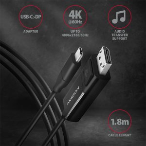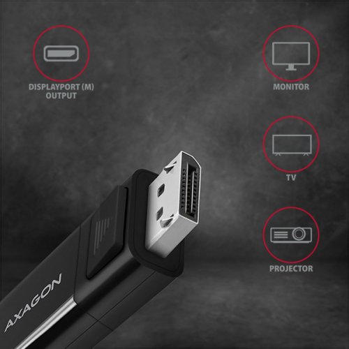 Aktivní USB-C -- DisplayPort kabel - redukce AXAGON RVC-DPC pro připojení DisplayPort monitoru/TV/projektoru k notebooku nebo telefonu pomocí USB-C konektoru.