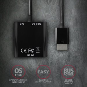 Aktivní převodník pro připojení VGA zobrazovače k PC s HDMI výstupem. Audio out.
