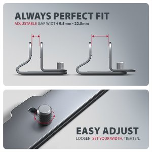 Vlastnosti: • Lehká a pevná kovová konstrukce. • Protiskluzová úprava, která zároveň chrání zařízení od poškrábání. • Vhodný pro 10"–17.3" notebooky nebo jiná zařízení. • Nastavitelná šířka 9.5–25.5 mm. • Kompaktní rozměry. • Držák notebooku umožňuje lepší odvod tepla. • Rozměry: 150 × 50 × 80 mm (Š × H × V). • Hmotnost: 177 g.