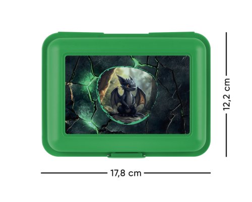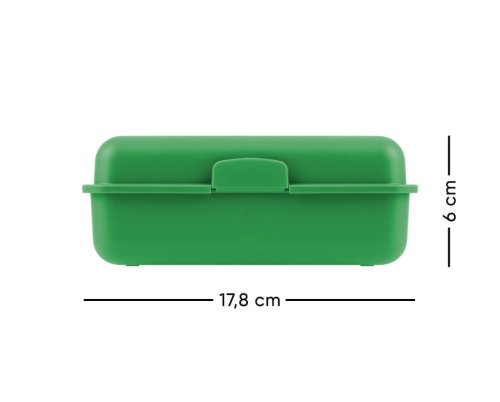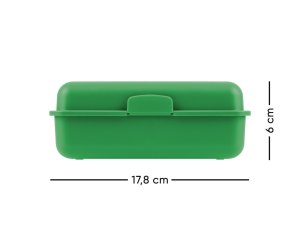 • Plastový box na svačinu v zelené barvě. • Box má uzavírání na jeden zámek a obsahuje dělicí přepážku. • Nedoporučujeme mýt v myčce.