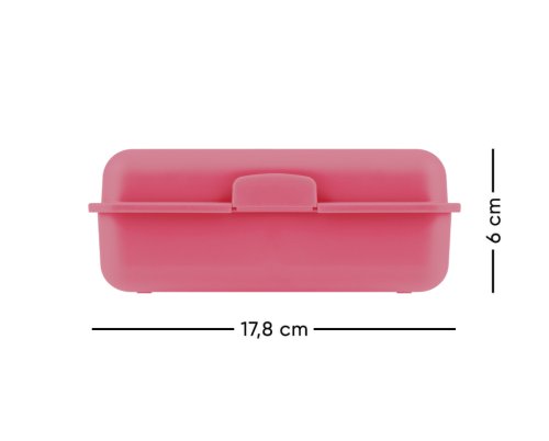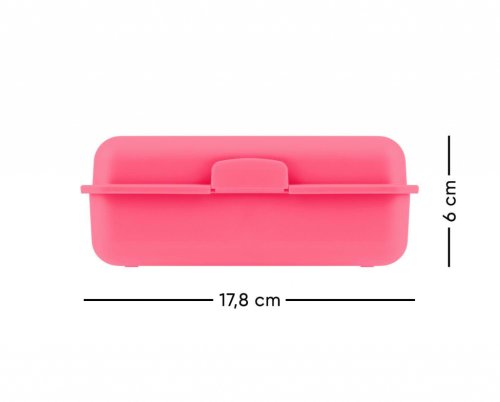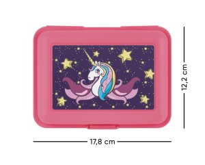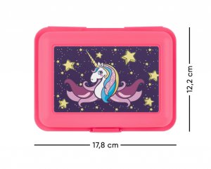 • Plastový box na svačinu v růžové barvě s obrázkem jednorožce. • Box má uzavírání na jeden zámek a obsahuje dělicí přepážku. • Nedoporučujeme mýt v myčce