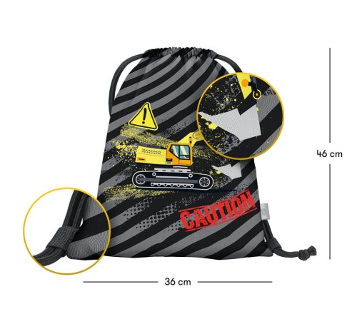 • Sáček na cvičky nebo přezůvky z pevného omyvatelného materiálu. • Zdrhování pomocí pevných tkanic, které zároveň umožňují nošení na zádech.