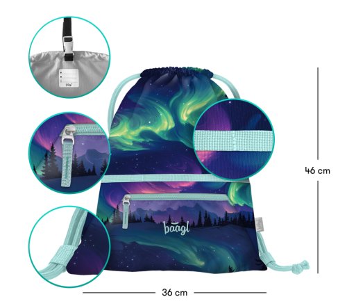 • Praktický sáček s kapsou na zip je vhodný nejen na přezůvky do školy, ale také na cesty, do města, na sportovní či jiné volnočasové aktivity.