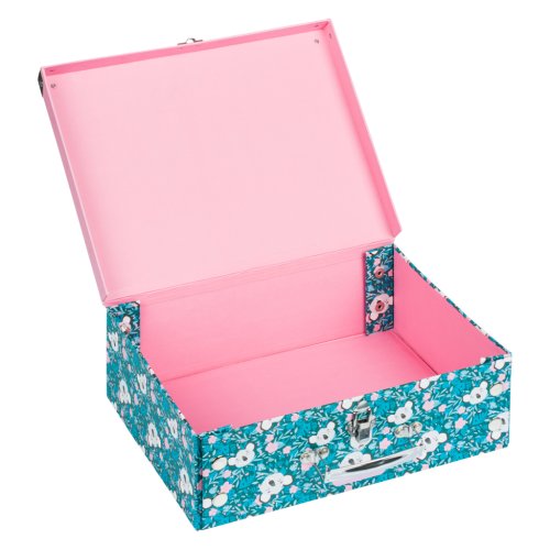 • Skládací kufřík z pevného laminovaného papíru s okovanými rohy.