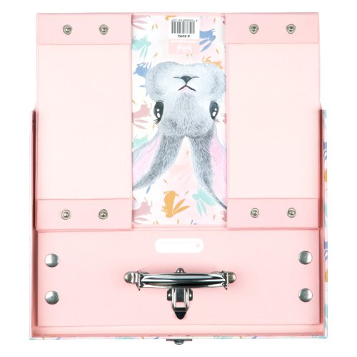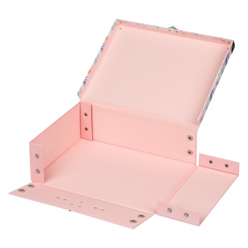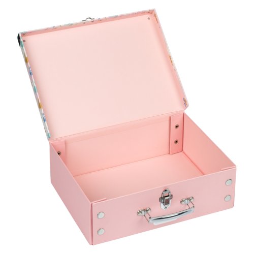 • Skládací kufřík z pevného laminovaného papíru s okovanými rohy.
