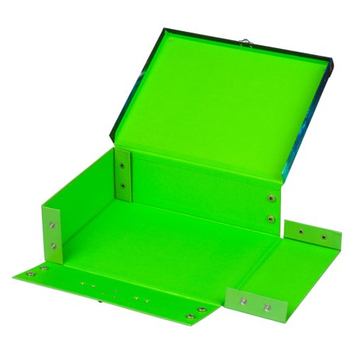 • Skládací kufřík z pevného laminovaného papíru s okovanými rohy.