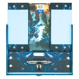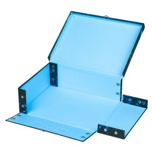 • Skládací kufřík z pevného laminovaného papíru s okovanými rohy.