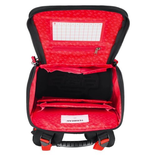 • Uvnitř aktovky je průhledná kapsa s rozvrhem a vnitřní organizér umožňující rovnoměrné rozložení hmotnosti, doplněný gumičkou pro fixaci.